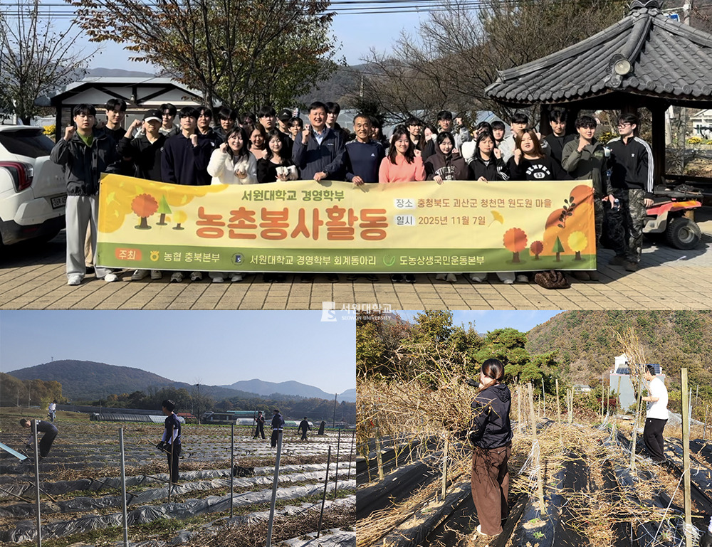 서원대학교 경영학부는 7일 충북 괴산 원도원 마을에서 충북농협과 함께 가을철 농촌 일손돕기를 진행했다. 이번 활동에는 학생 40여 명과 농협충북본부 임직원이 참여해 지역 농가의 수확기 노동 부담을 덜기 위해 힘을 모았다.