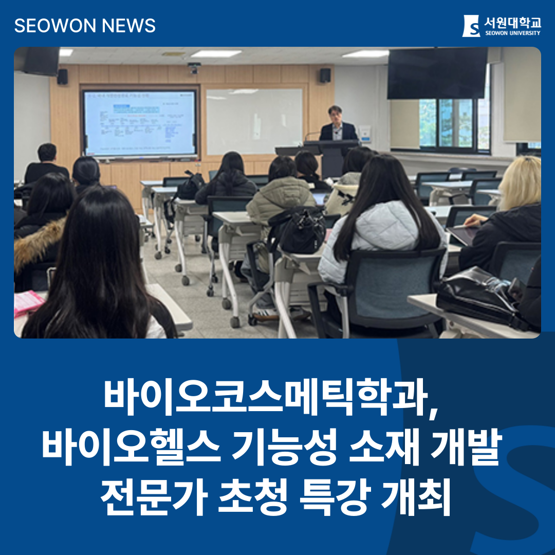 서원대학교 바이오코스메틱학과는 RISE사업의 일환으로 19일 충북 청주의 대표적인 바이오헬스 관련 소재·제품 개발 전문기업인 ㈜노바렉스의 정판여 연구개발센터장을 초청해 ‘Inner Beauty 소재개발 연구’를 주제로 특강을 진행했다.