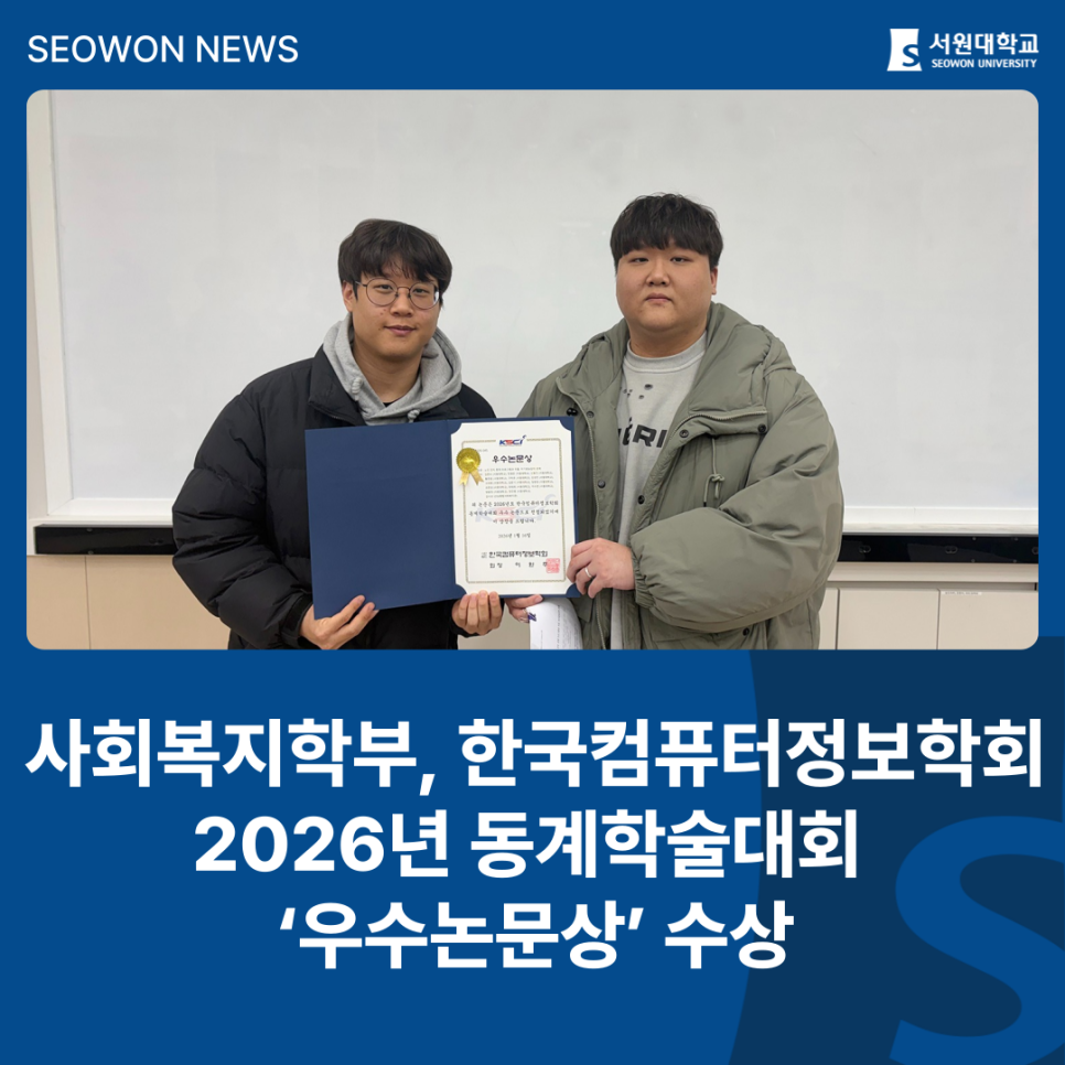 서원대학교 사회복지학부 학생들은 한국컴퓨터정보학회 2026년 동계학술대회에서 ‘노인 인지 중재 프로그램과 우울, 자기효능감의 관계’ 논문으로 우수논문상을 수상했다.