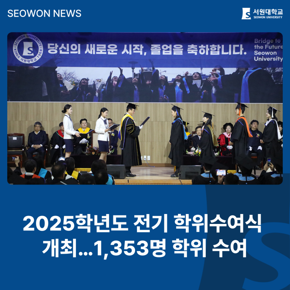 서원대학교는 24일 목민관에서 2025학년도 전기 학위수여식을 개최하고 학부 1,306명과 대학원 47명 등 총 1,353명에게 학위를 수여했다.